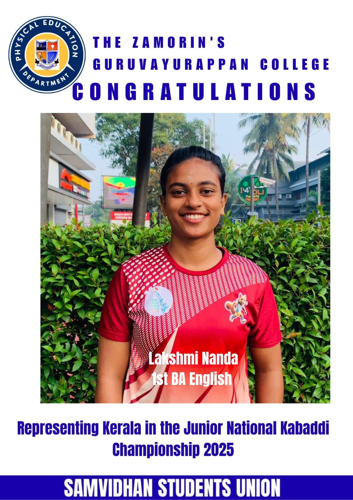 Congrtulations to Lakshmi Nanda, a 1st year student in BA English Programme representing Kerala in the Junior National Kabaddi Championship 2025.