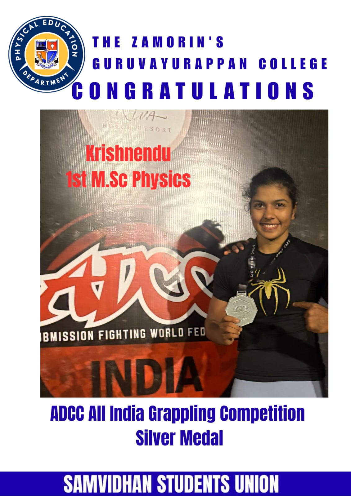 Congratulations to Krishnendu, a student from 1st M.Sc Physics Programme,for winning the Silver Medal in the ADCC All India Grappling Competition. Your dedication and strength have brought immense pride to us all.