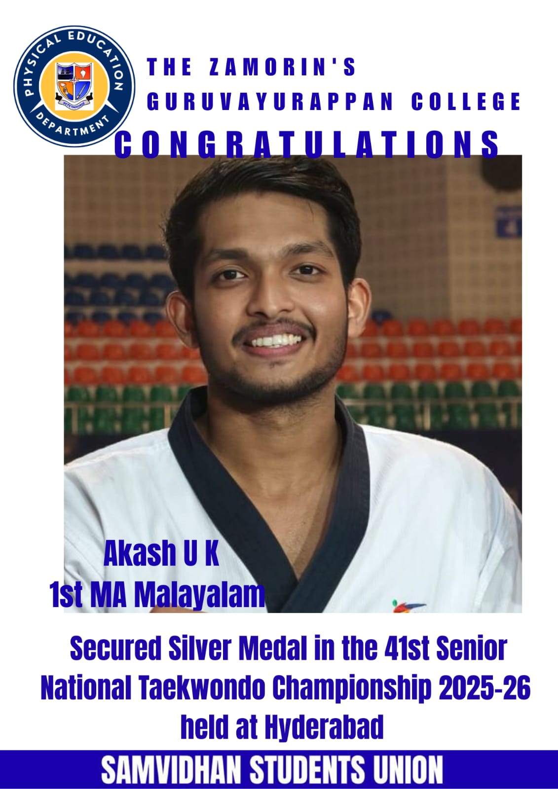 Congratulations to Akash U K,1st MA Malayalam student,for winning the silver Medal in the 41st Senior National Taekwondo Championship 2025-26 held at Hyderabad.Your dedication and strength have brought immense pride to us all.