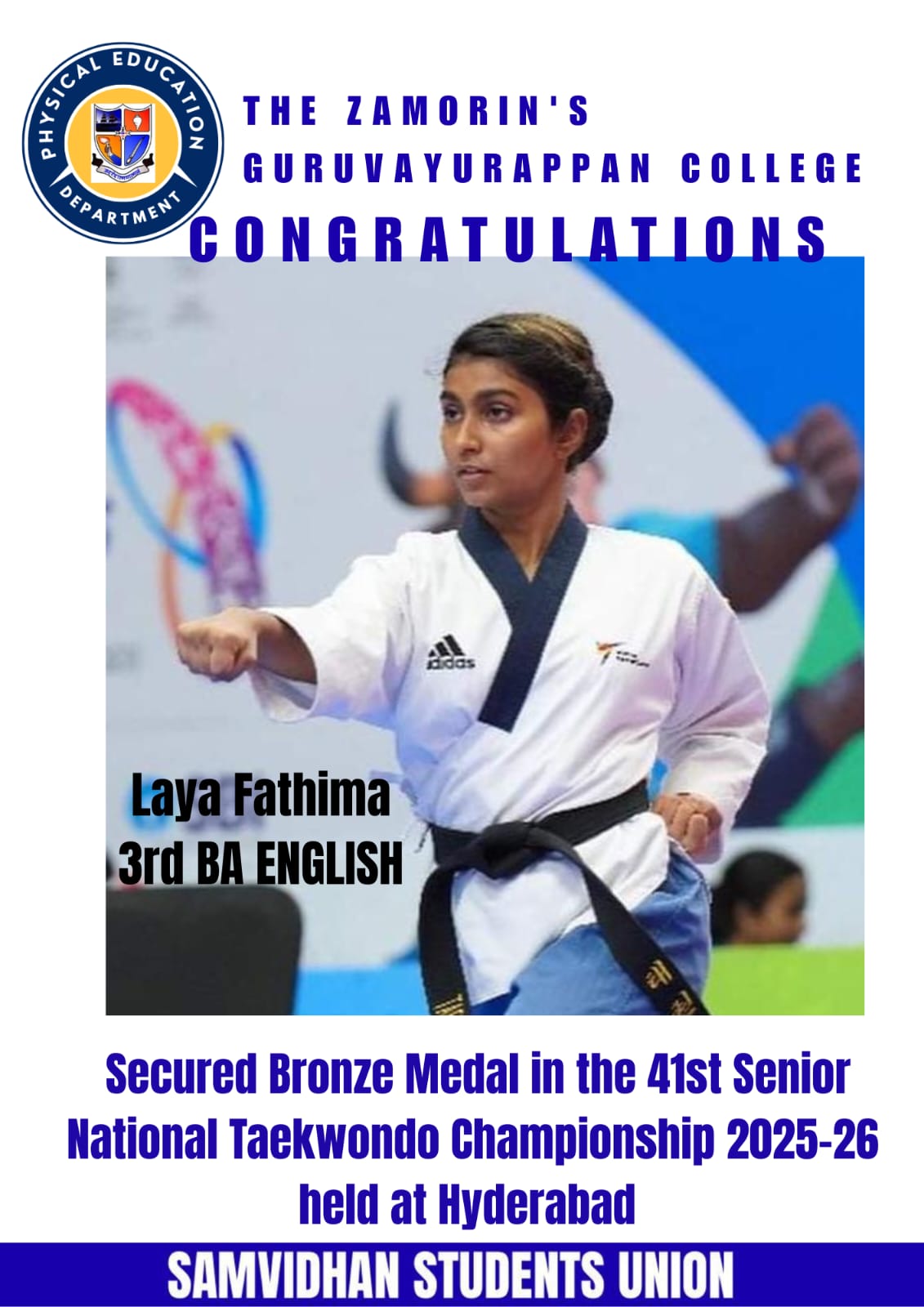 Kozhikode, November 2024 – Laya Fathima C.K., a 2nd-year BA English student from The Zamorin’s Guruvayurappan College, has brought pride to the institution and the state of Kerala by securing a silver medal in the Senior Female Individual Poomsae category at the 2nd Khelo India National Asmitha Women’s Taekwondo League 2024-25. The prestigious event was held at the R.N. Shetty Indoor Stadium, Dharwad, Karnataka, from 18th to 20th November 2024