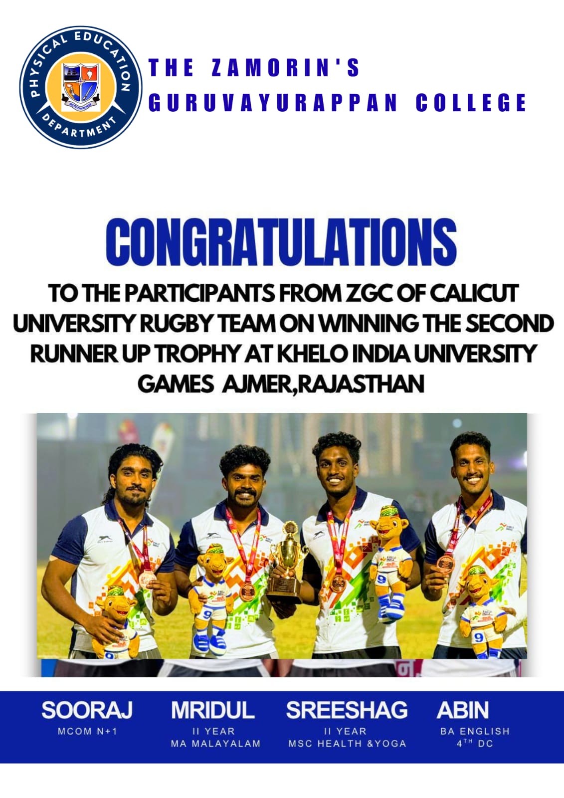 Congratulations to the Participants from Zamorins Guruvayurappan College of Calicut University RUGBY Team on winning the Second Runner Up Trophy at Khelo India University Games held at Ajmer,Rajastan.